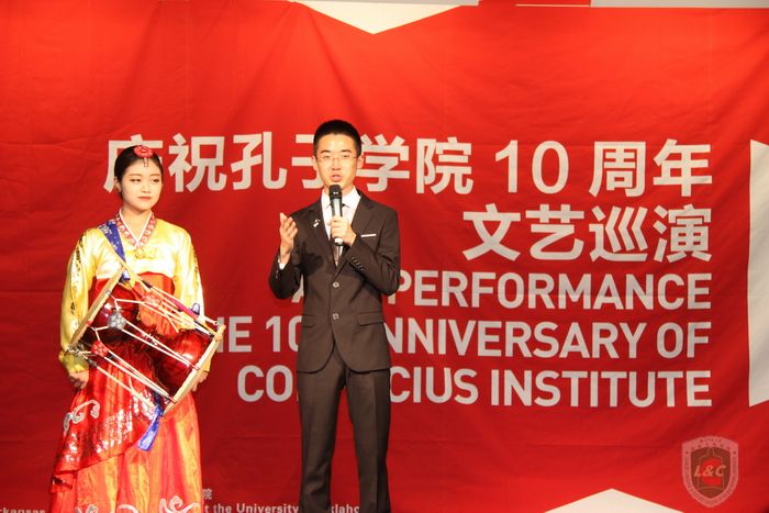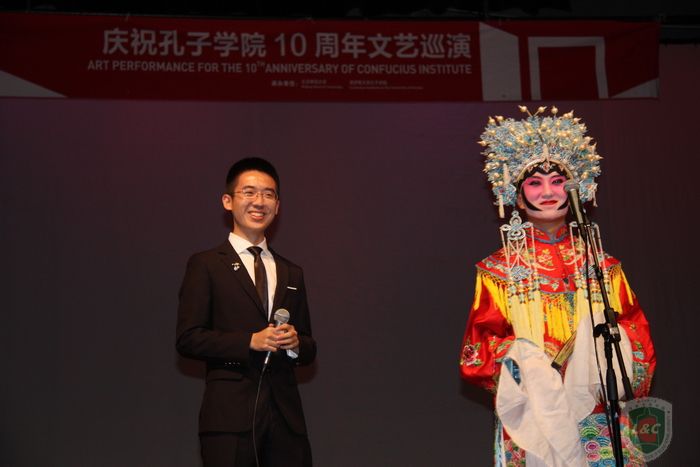 王冬同学作为此次活动的双语主持人,充分发挥之前在文艺活动导演、主持方面积累的经验,参与到了双语主持撰稿、互动环节设计和行前事务安排等工作中。演出中,王冬以流利的普通话和英文、良好的现场把控能力和幽默自然的主持风格受到好评,圆满完成了巡演任务,充分展示了我院学子的风采!