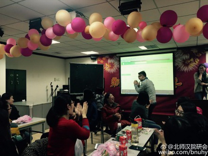 1月12日下午三点半,主楼308会议室熙熙攘攘,座无虚席。经过一个学期紧张、忙碌的学习生活,由一百多名中外学生组成的2015级硕士研究生班这个大集体,终于利用暂短的闲暇,团聚在了这里。活动开始,班主任老师首先发言,对班级情况进行了概况总结,对同学们本学期在学习、实践、外派志愿者选拔和参与学院活动中的表现给予了充分肯定,并鼓励大家继续努力,共同进步,同时强调,2015级是一个团结的整体,尽管有同学陆续外派,但依然要保持大班级的凝聚力。老师的发言给了大家很大的鼓舞。随后,班长和支部书记们分别就各自分管的工作向全体同学做了简要汇报,并对即将前往世界各地的志愿者同学表达了来自班集体的祝福与关怀。已经确定外派英国、韩国、挪威和新西兰的志愿者代表先后上台发言,他们动情的回忆了迎接外方和国家汉办面试过程中,大家相互支持合作共赢的情景,以及在集中培训时表现优异为北师大增光的经历,特别向学院、老师以及班级同学们表达了诚挚的感激之情,正是大家的共同努力与无私帮助令他们有机会成为先行一步的汉办志愿者,并在紧张的培训之余仍能顺利完成学校的各项任务与考试。随后留学生代表也上台发言,表达了与同学们相识相知、共同学习的快乐。