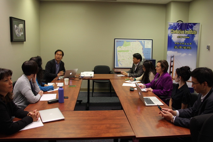 4月11日,旧金山州大孔院与来访的华南理工大学国际教育学院安然院长一行举行了座谈会,两院共商中文教学与孔子学院持续发展合作项目。孔子学院协调安排州大中文系主任、教授及项目主管在州大人文楼中文部会议室与代表团举行合作交流项目讨论会,双方就两校教授合作开展跨文化研究项目、建立美国理工学生到华南理工学习汉语的中文教育项目、开展中美大学生双向交流等合作事宜进行了磋商。