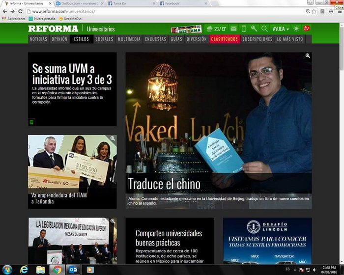 近日,墨西哥国立自治大学的外语中心举办了《中国现代短片小说选集》新书发布会。该书由北京师范大学汉语文化学院四年级的本科生Alonso Coronado(陆子龙)翻译,墨西哥Abismos 出版社出版。参加本次发布会的有墨西哥国立自治大学外语中心亚洲语言部部长Ricardo Cornejo、墨西哥学院著名汉学家 Liljana Arsovska 等人以及数十位自治大学的师生。与会者对北师大的本科生陆子龙的译本进行了讨论,次日在墨西哥城的咖啡厅 Naked Lunch 举行了第二次发布会。