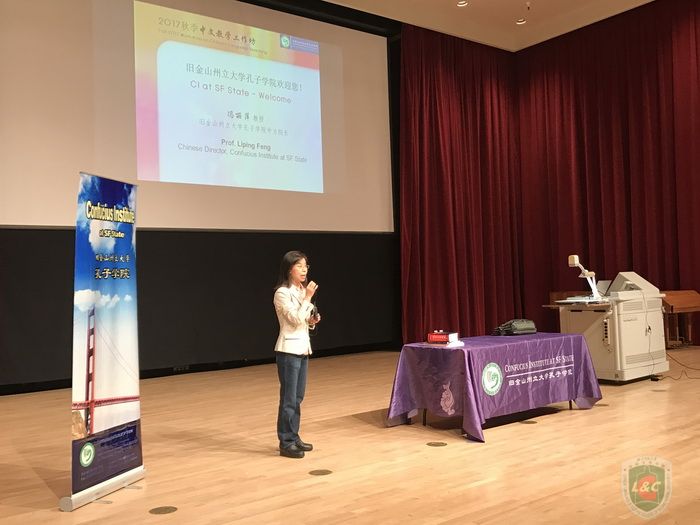 旧金山州大孔子学院中方院长冯丽萍教授首先代表孔院向参加工作坊的老师们表示欢迎,她介绍了孔院近期的活动,希望能与当地中文教师增进交流与合作。 冯教授还与大家分享了旧金山州立大学孔子学院下属孔子课堂西塞拉中学学生黄秋月刚刚荣获第十届“汉语桥”世界中学生中文比赛总冠军的喜讯,在场的中文教师纷纷鼓掌庆祝北加州中文教学再结硕果。