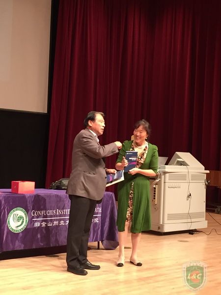 图四:旧金山州立大学孔子学院谢家新院长为中奖老师颁发奖品