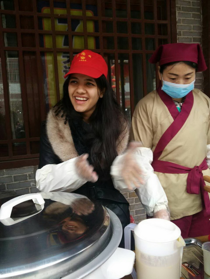接下来的几天,留学生同学们开始了各自的实习销售工作的体验。岗位设置在极具当地特色的4A级景区——“河上街”,“河上街”以漯河河上街历史为背景,汇聚中原民俗文化,荟萃古典建筑风格。春节期间,河上街庙会活动以喜庆、热闹为主旋律,展现民间艺术、经典民俗节目为主要内容。在河上街古镇全国旅游特色产品展销中,有辽西化石、阜新玛瑙、天津泥人张、衡水内画,吹糖人、剪纸、民间字画、舞龙、动物表演等原汁原味的民间艺术表演。同学们在河上街进行销售工作,锻炼了语言能力的同时,更深刻地体会到了民间文化的丰富多彩。