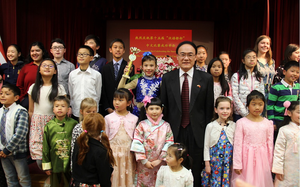 美西时间2019年4月12日,第十五届“汉语桥杯” 中小学生中文比赛颁奖典礼在旧金山马莲拿中学(Marina Middle School)成功举办。中国驻旧金山总领馆副总领事邹永红、教育参赞唐筠、教育领事李韧竹、旧金山州立大学协理副校长吴彦...